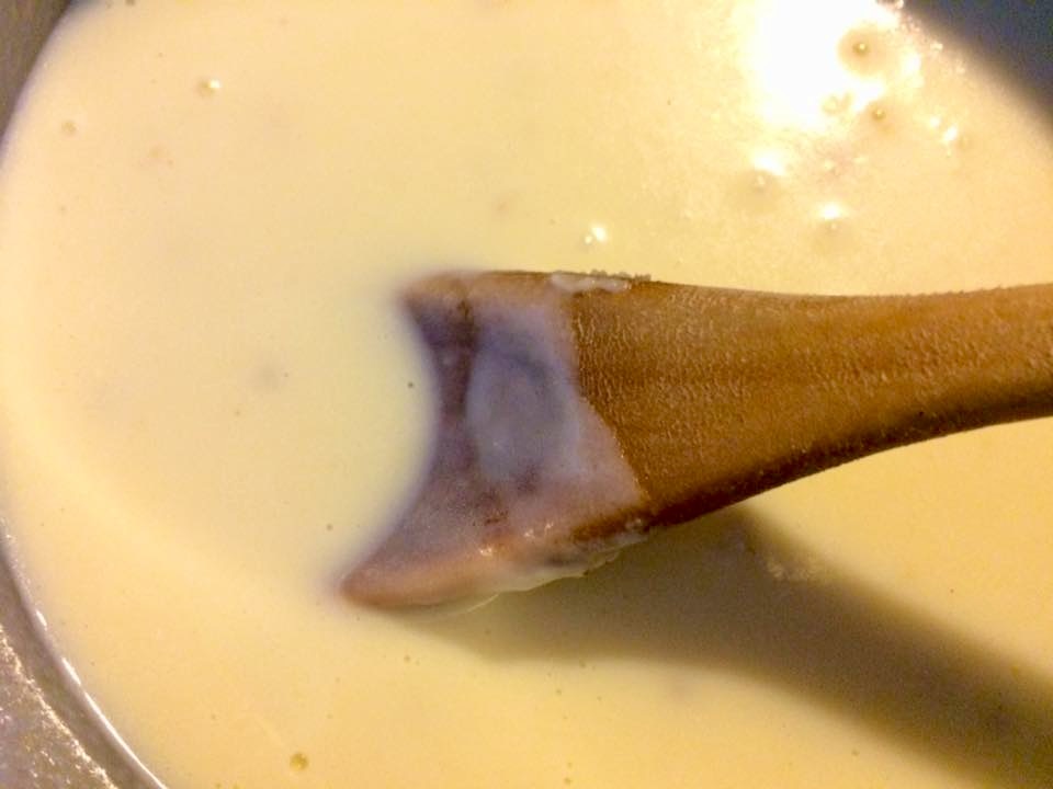 - Add milk approximately 1/4 cup at a time, and stir until blended and becomes slightly thickened.